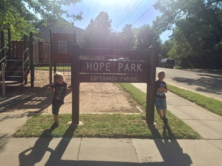 Hope Park is little neighborhood park at the corner of 14th and Emporia (1457 N. Emporia). The kids liked that it resembles a log cabin!