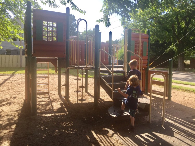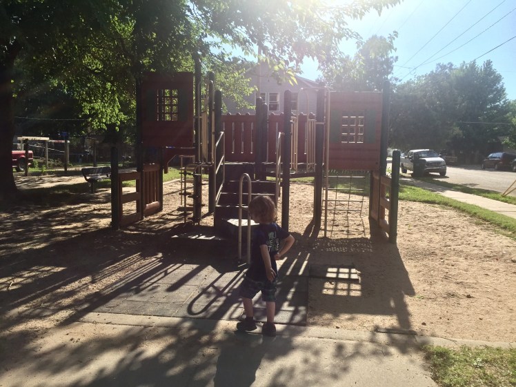 Mom Tips: This park is right on the street, with no fence. It wasn’t a terribly busy street, but the proximity is worth noting. The playset is under a mulberry tree, which is unfortunate. Good for shade, but the berries were everywhere in the sand. And with the berries in this heat come bugs and birds (and their poop). Make sure you wipe your feet before getting back in the car! ** I bet later in the summer/fall this is a non-issue. **