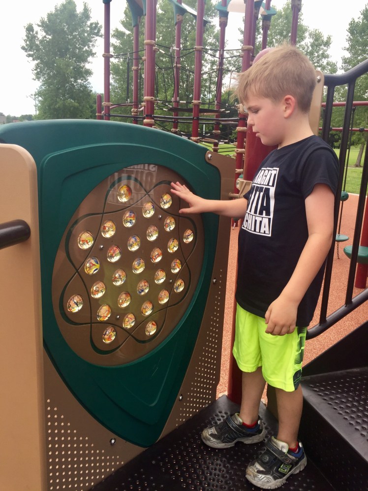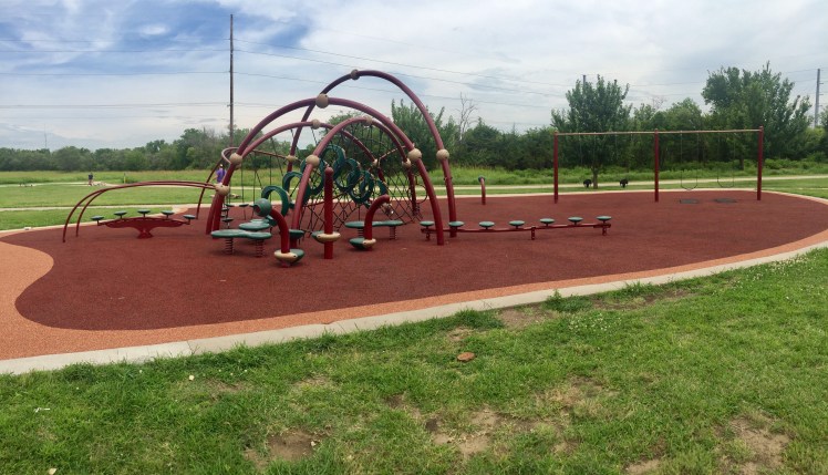 The Wichita Parks and Rec site says there’s two playgrounds here, one on the east side and one on the west side. But we could only find the one on the east side. It looks like the west side playground was removed.