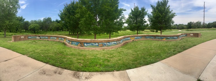 My favorite part was a low wall with a stunning Kansas mosaic mural. I vaguely remember there being a buffalo statue here, but it’s not there anymore.