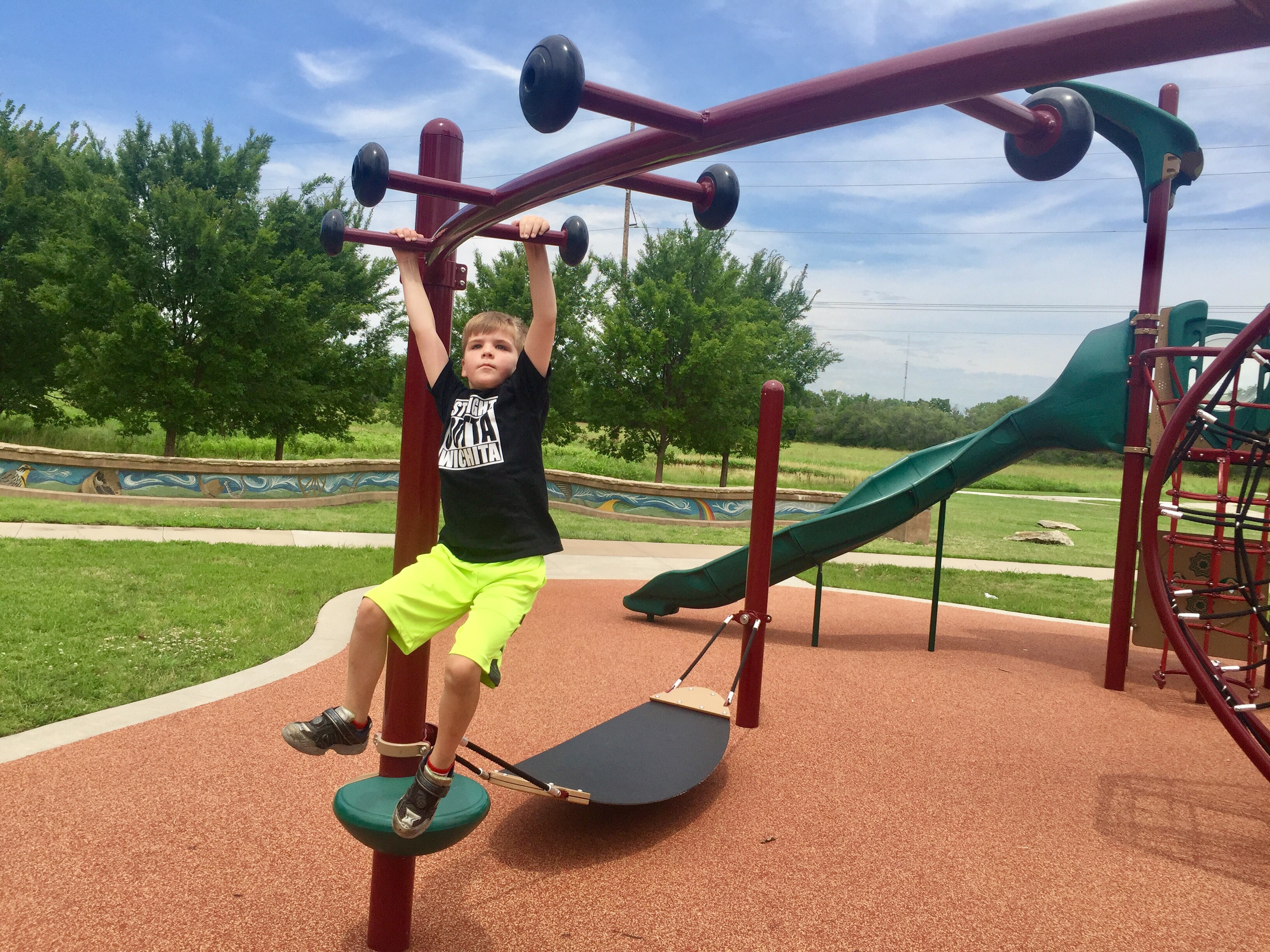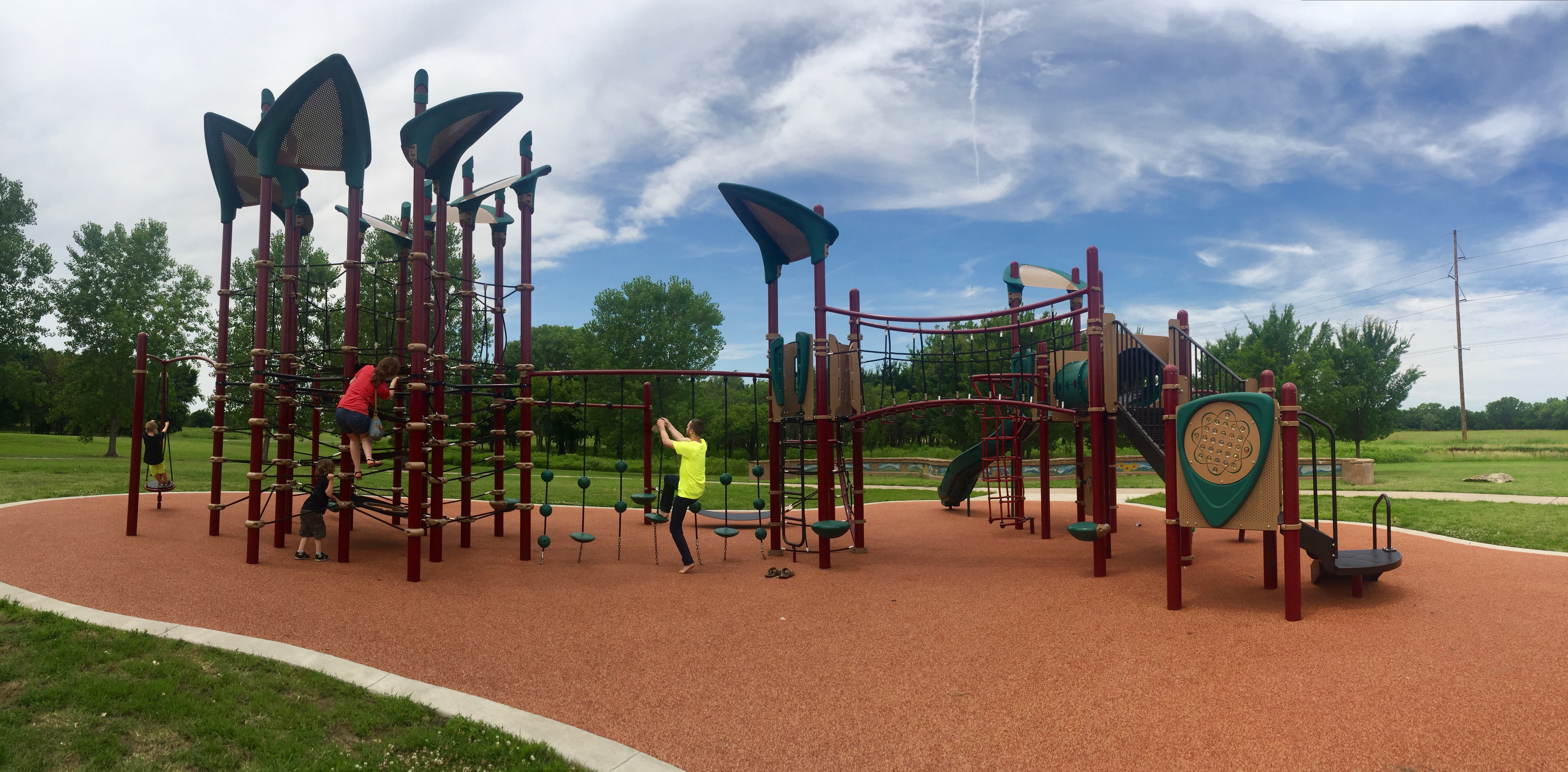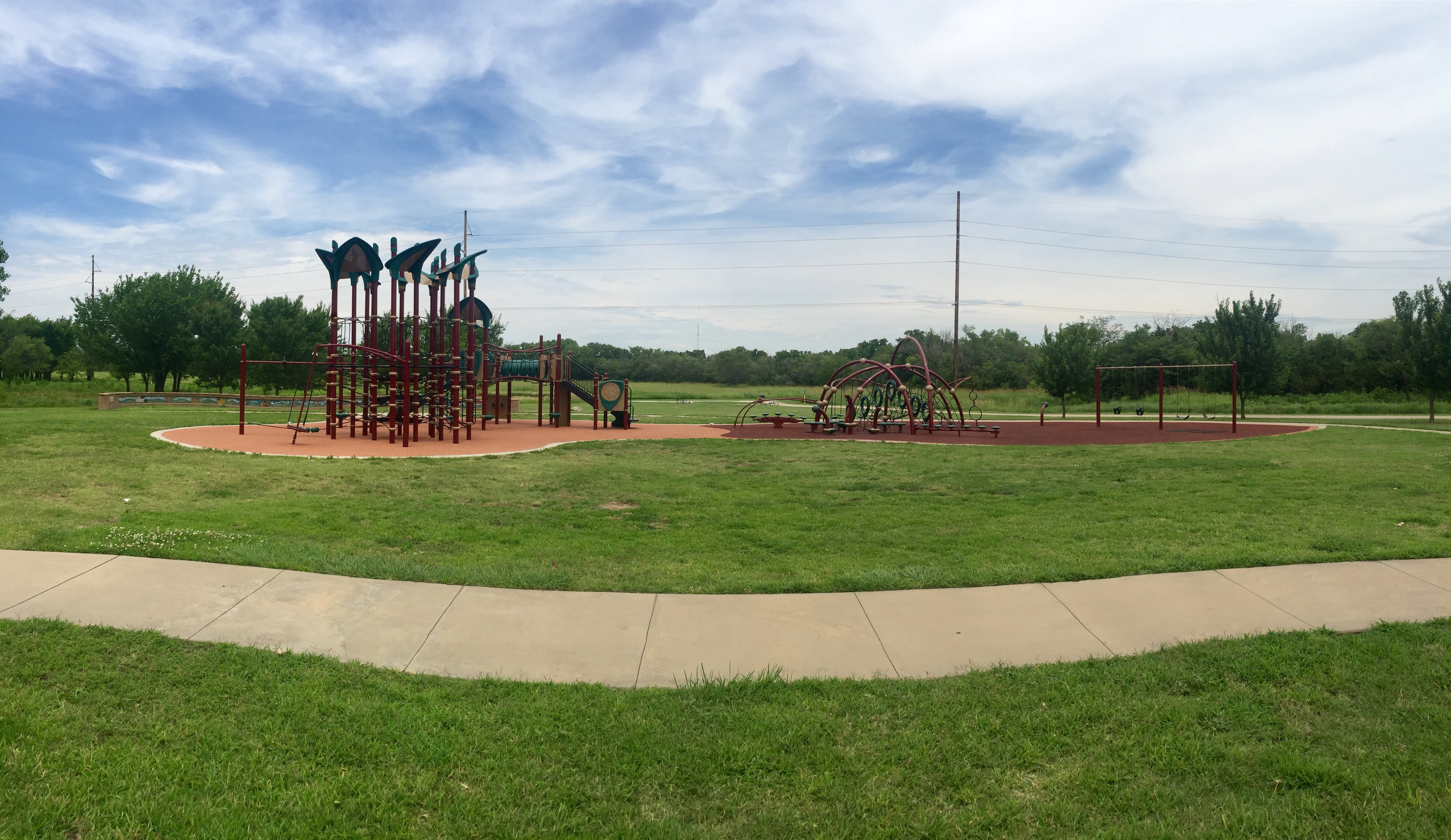 The Wichita Parks and Rec site says there’s two playgrounds here, one on the east side and one on the west side. But we could only find the one on the east side. It looks like the west side playground was removed.