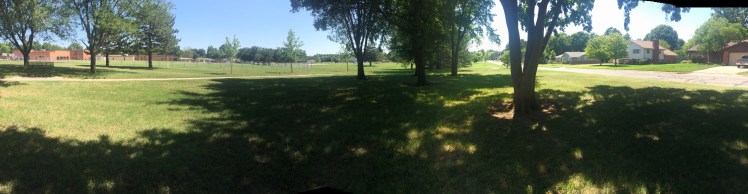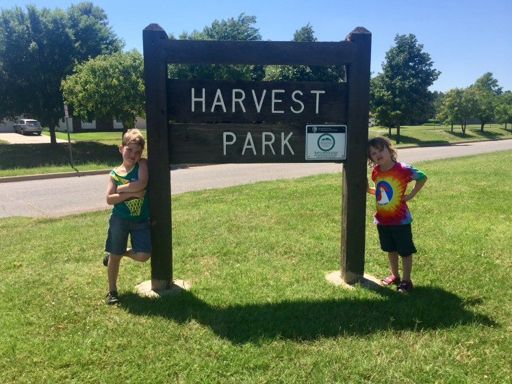 Harvest Park sits next McCollum Elementary School, which is in the neighborhood southwest of 13th and Tyler (9500 Provincial Lane). It’s a nice, shady park with lots of park benches and a winding paved sidewalk. There isn’t a playground, but the pool made the boys happy.