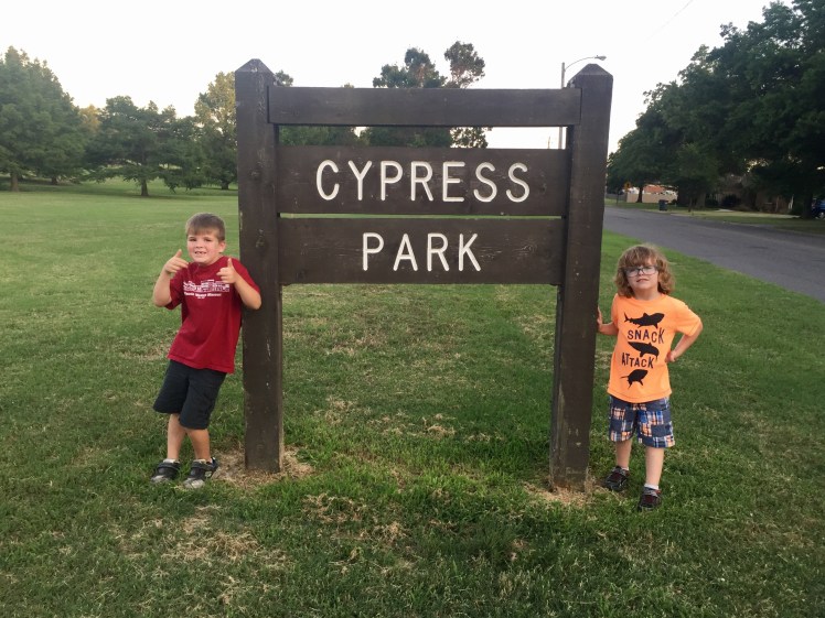 What a beautiful park! Cypress Park is a lush oasis off of Edgemoor, near Kellogg. It has a stunning row of cypress trees, a creek, and a lot of open space for kiddos to run. In fact, it was so picturesque, there was a professional photo shoot happening while we were there.