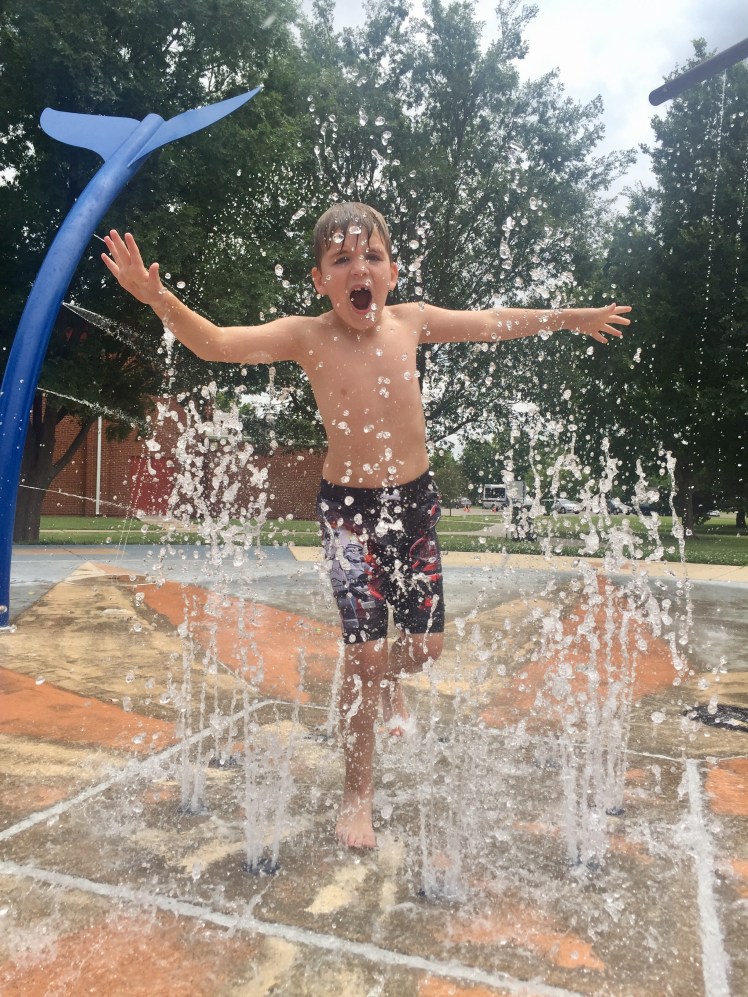 Mom Tips: The playground was pretty close to the splash pad, so many kiddos (including mine) were running back and forth from one to the other. This made the equipment kinda slippery, so proceed with caution. The bathrooms are on the north side of the building. Oh, and the interactive fountains are on a timer. If they shut off, hit this button near the frog sprayer: