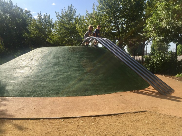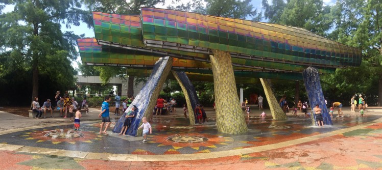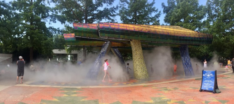 We started with the more interactive of the two splash pads. This one was a masterpiece of mosaic and steel, which had multiple spray settings. Thunder sounds would play and water would rain down from the beams. Water would also spray up from the beautiful mosaic sunflowers on the ground, and then steam would flow and carpet the entire area in delightfully refreshing mist.