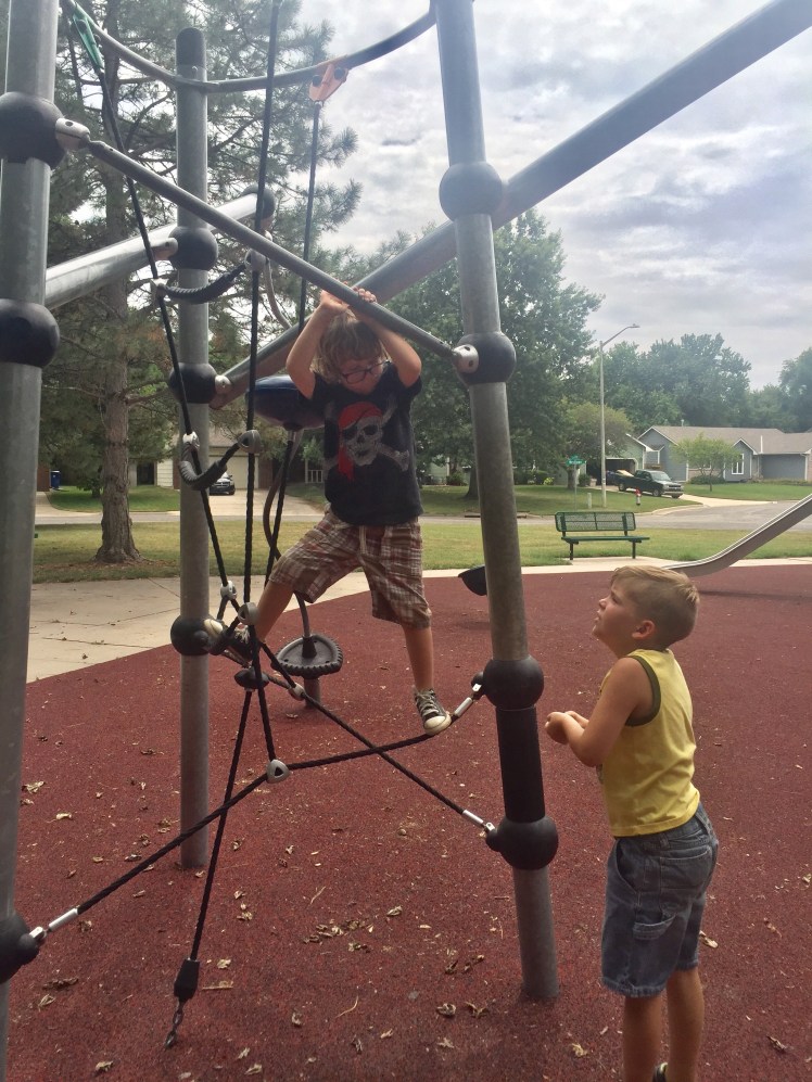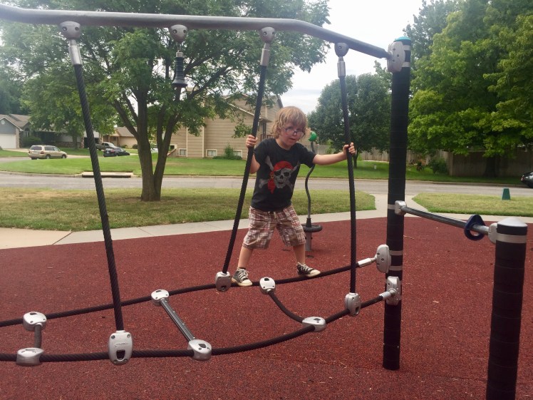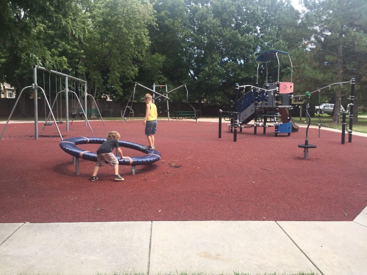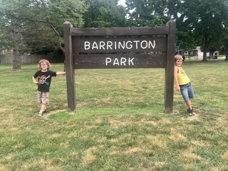 Out of all the parks we visited on this day, this is the one we played at the longest. Barrington Park is located back in a neighborhood (2010 N. Tee Time) and has the climbing equipment the boys love, plus the rubber playground base that I love. ((Sand is not my friend….))