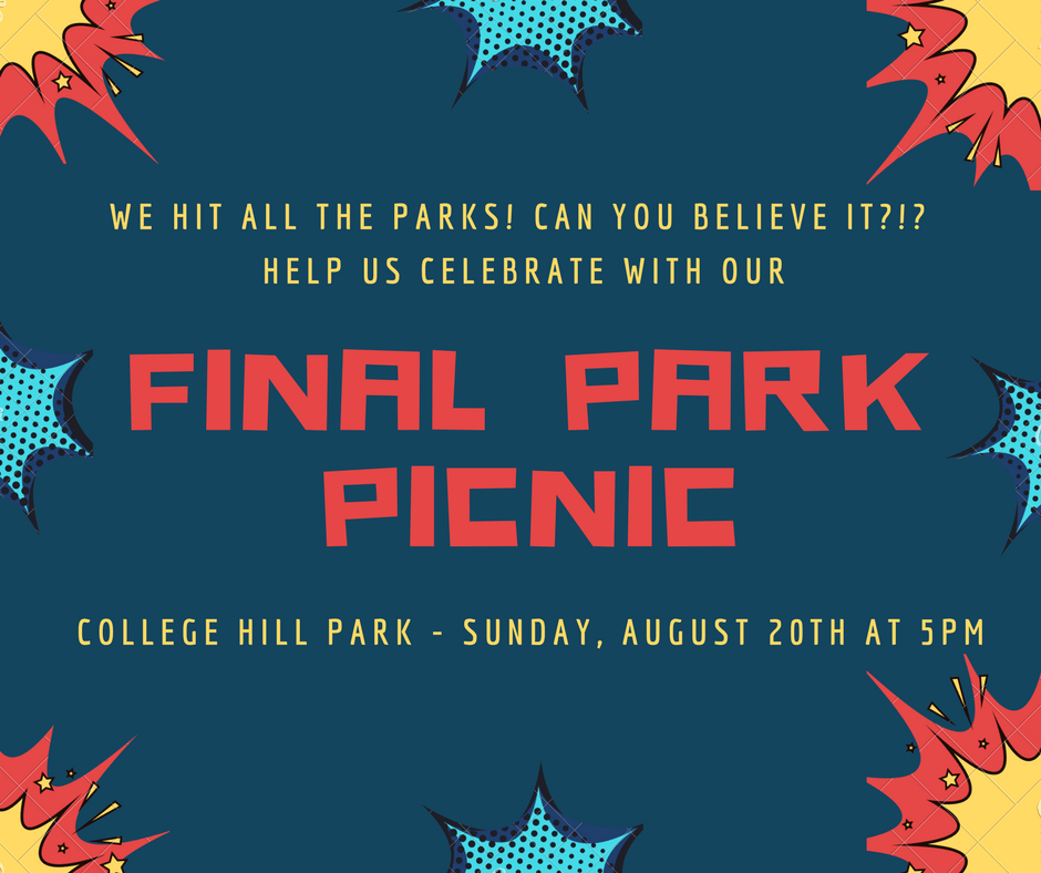 Sunday we’re celebrating our final park: College Hill. We’ll be picnicking around 5pm if anyone would like to join us and talk parks!